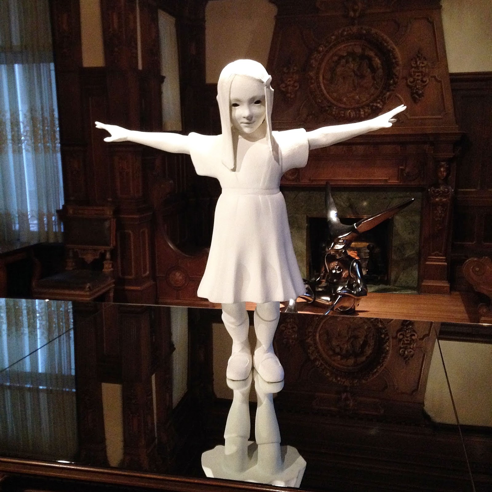 Simonsson, whose work has been displayed around the world, hails from Fiskars, Finland. His wonderful, yet sometimes disturbing, creations are crafted in ceramic and depict life-sized children and animals, which are described as evoking a fairytale-like world. As it turns out, the Turnblad home is an ideal setting for this exhibit, as these fanciful creatures pop up throughout the rooms of the Chateauesque mansion that is the central building of the cultural center.